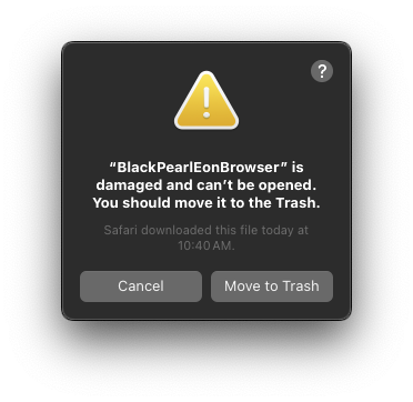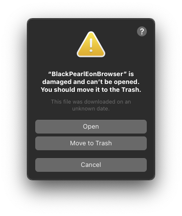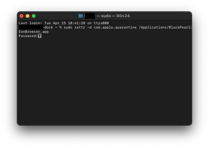 - Open the Terminal app and type the following: sudo xattr -d com.apple.quarantine /Applications/BlackPearlEonBrowser.app
