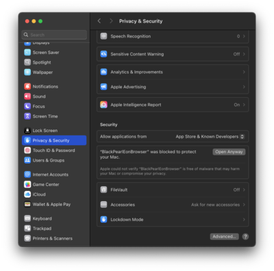 - After running the command, open the Eon Browser app again and you will see the same pop-up again saying the app cannot be opened. Close the pop-up and navigate to System Settings > Privacy & Security, then scroll down to the “Security” section and you will see a prompt to allow Eon Browser to open. Click “Open Anyway” and reopen the Eon Browser app.